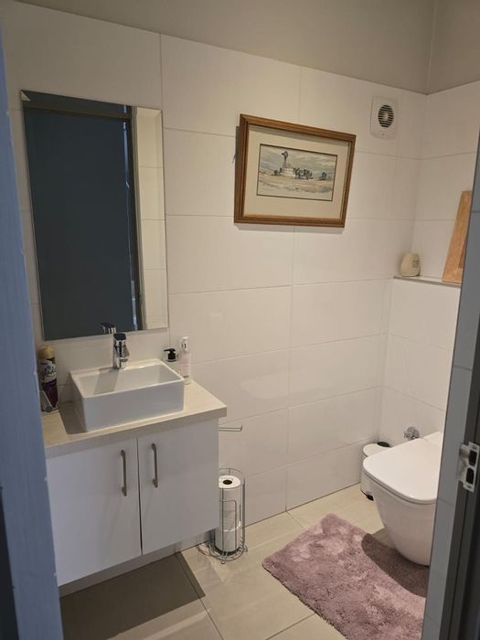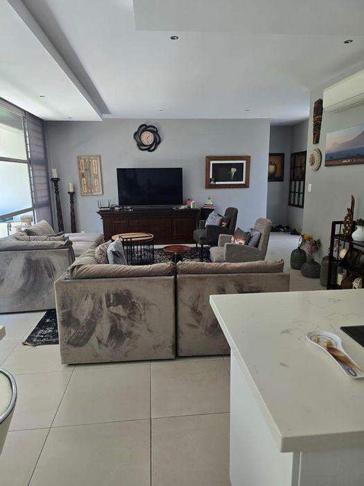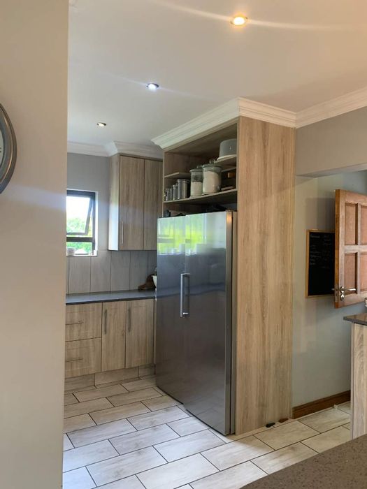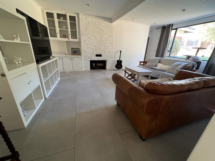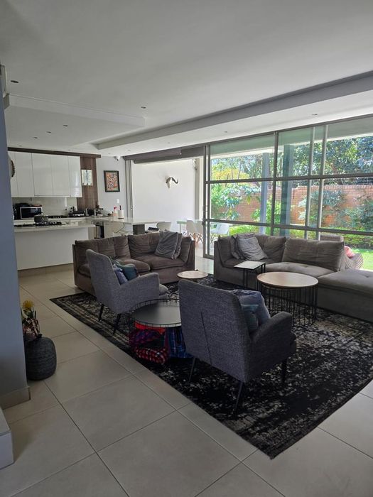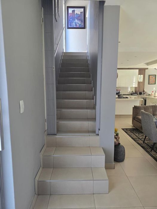 Contemporary living in a peaceful cluster with eclectic finishes: open-plan lounge and dining flow to patio and gas SMEG kitchen. Upstairs: three beds, two-and-a-half baths, double garage; solar negotiable.