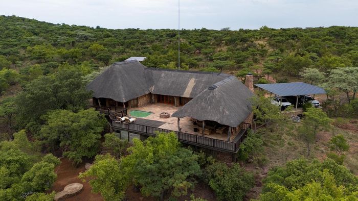 Bush-side luxury retreat for relaxed family living, just 1.5 hours from JHB, featuring an open-plan kitchen, built-in bar, private pool, three bedrooms and two bathrooms.