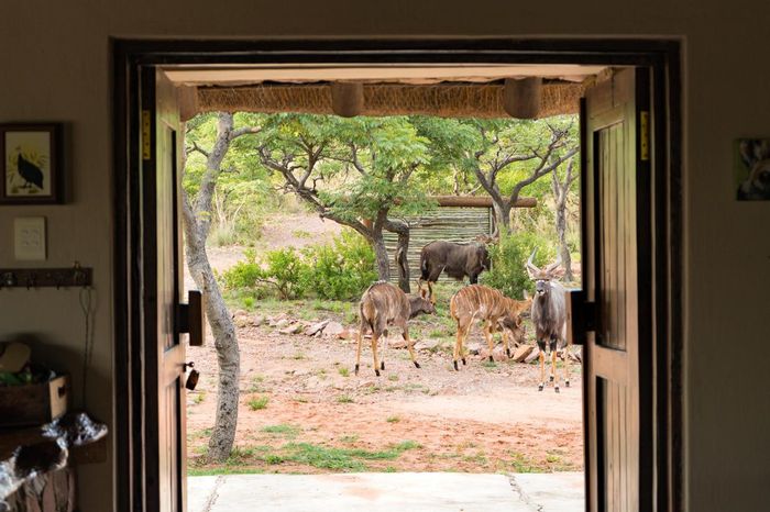 Hill-edge living with expansive farm views and wildlife watching from the adjacent boma and game viewer; fully furnished open-plan home with loft, three bedrooms, two bathrooms, and covered double carport.