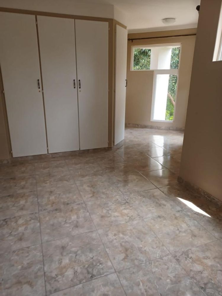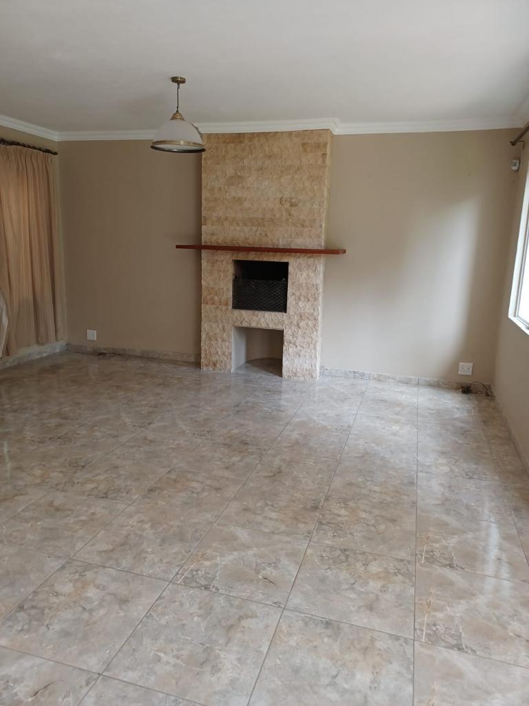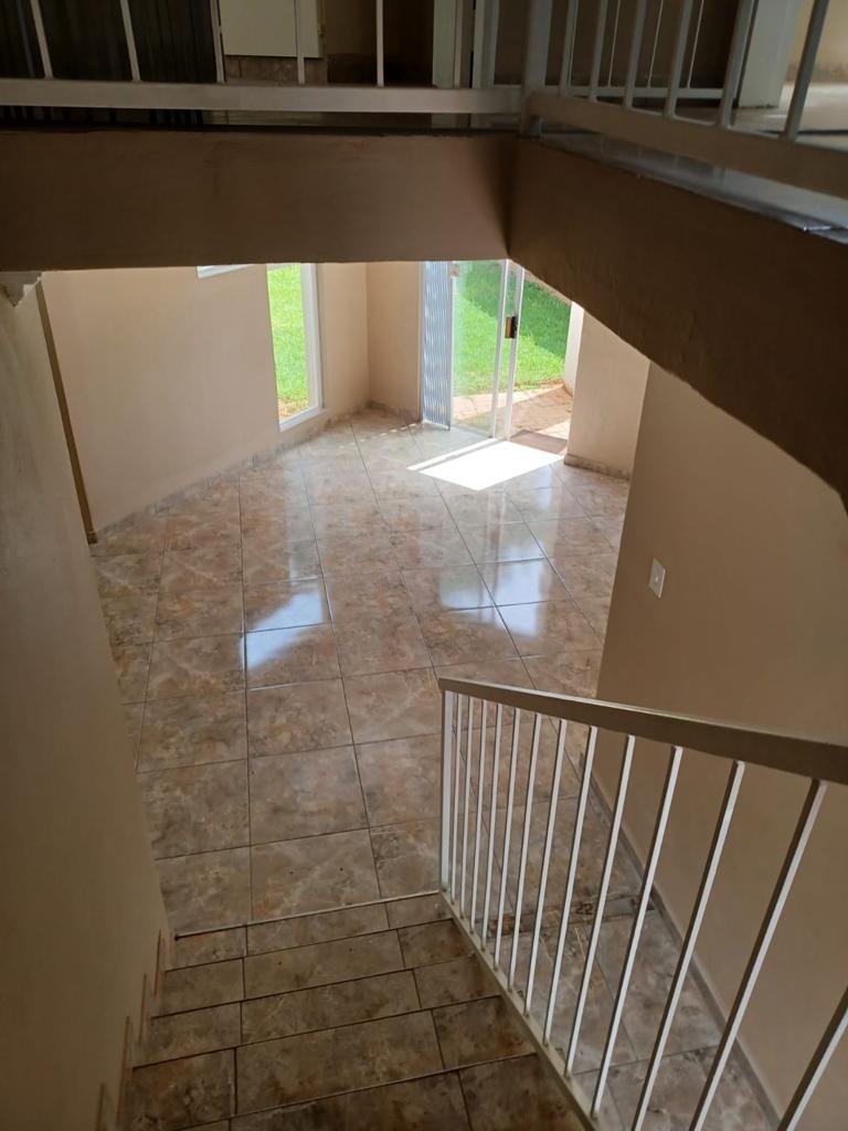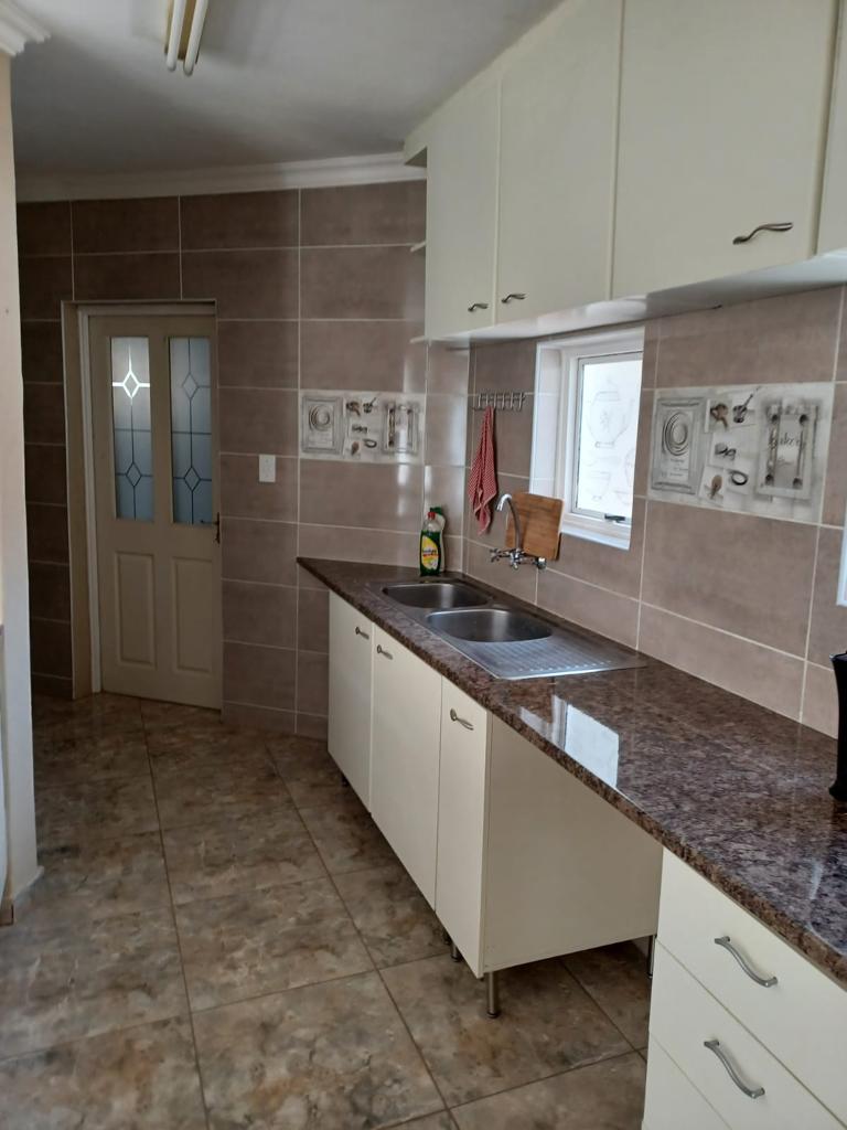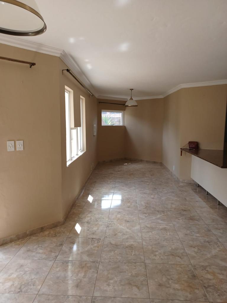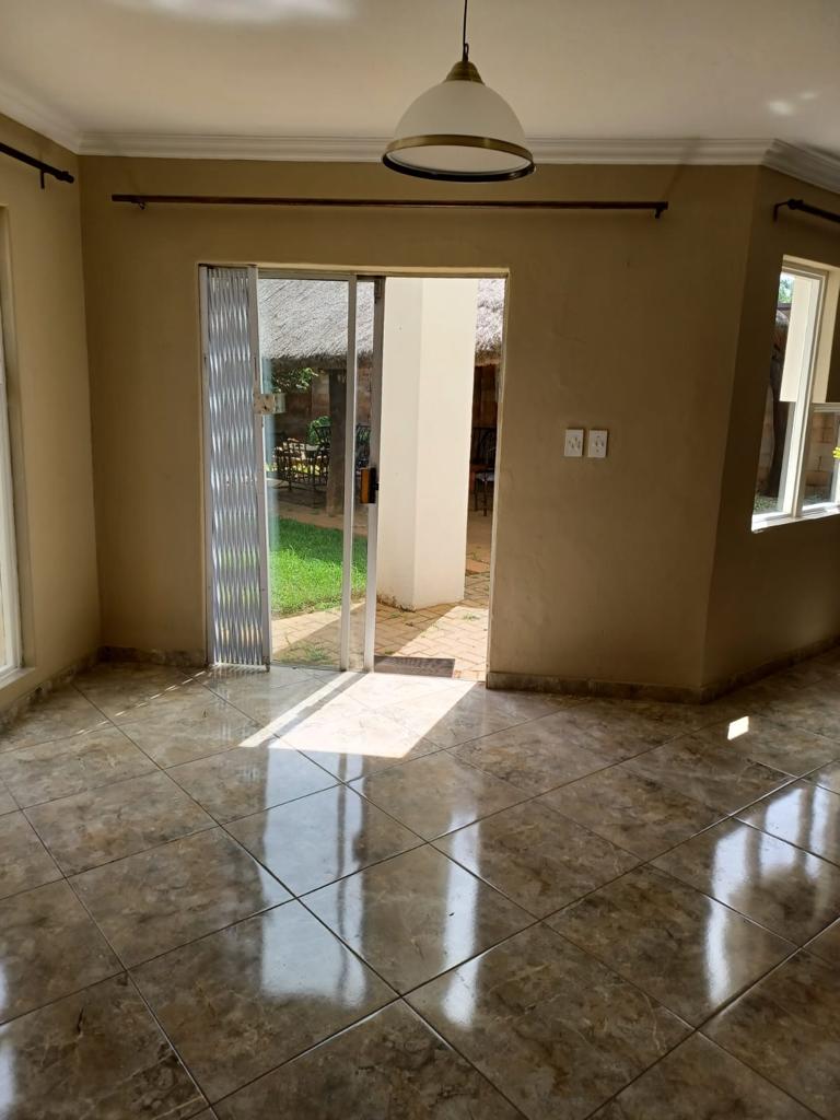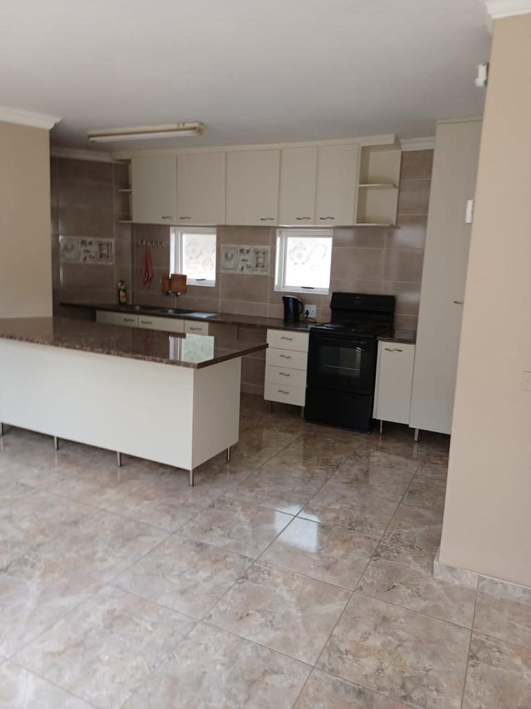 Upstairs : Three bedroom with 2 bathrooms, Downstairs: Spacious open plan lounge , dining area onto kitchen with gas stove, direct access from double garage to kitchen, Spacious garden with large wooden shed and thatched lapa braai area, fully enclosed and safe for dogs.